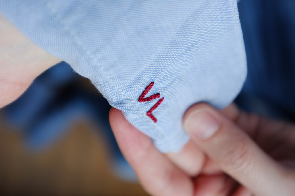 As the fabric is rather boring I new that I wanted to personalise the shirt a little bit. I decided to embroider my brother’s initials on the inside of the cuffs and added a little message to the inner back yoke. It was my first time to do embroidered lettering and I had to try a couple of different techniques to find one that worked well. I finally settled on a chain stitch which might not look 100% professional but at least the embroidery is readable. As I didn’t know if I would have time to actually do the embroidery I added it last minute to the finished shirt which made it quite fiddly. It also didn’t help that I didn’t have embroidery thread and had to use 6 strings of normal sewing thread. On top of that I finished it off on the bus and at the airport, which is definitely not the best place for crafting. In the end it turned out allright and I love that it is on the inside of the shirt, a secret message for the wearer.