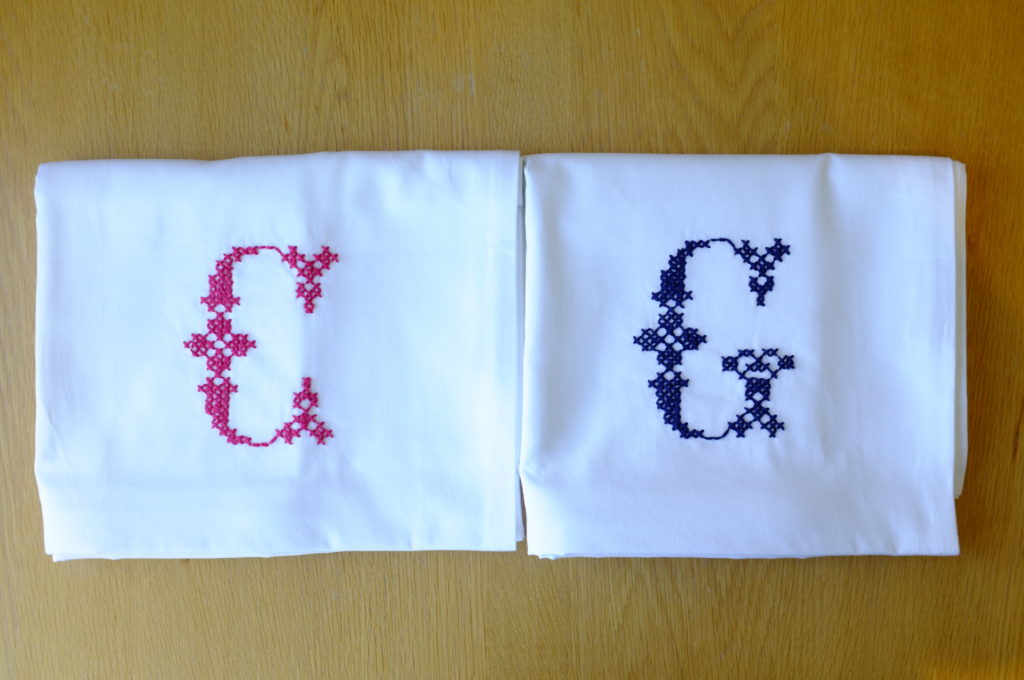 For the two pillow cases I went with the initials again in a simple cross-stitch pattern. I found one where the G and the C were both based on the same base shape. The whole alphabet is available here. I omitted the squiggles (is that actually a word?) and embroidered them the same way as I had the flower heart.