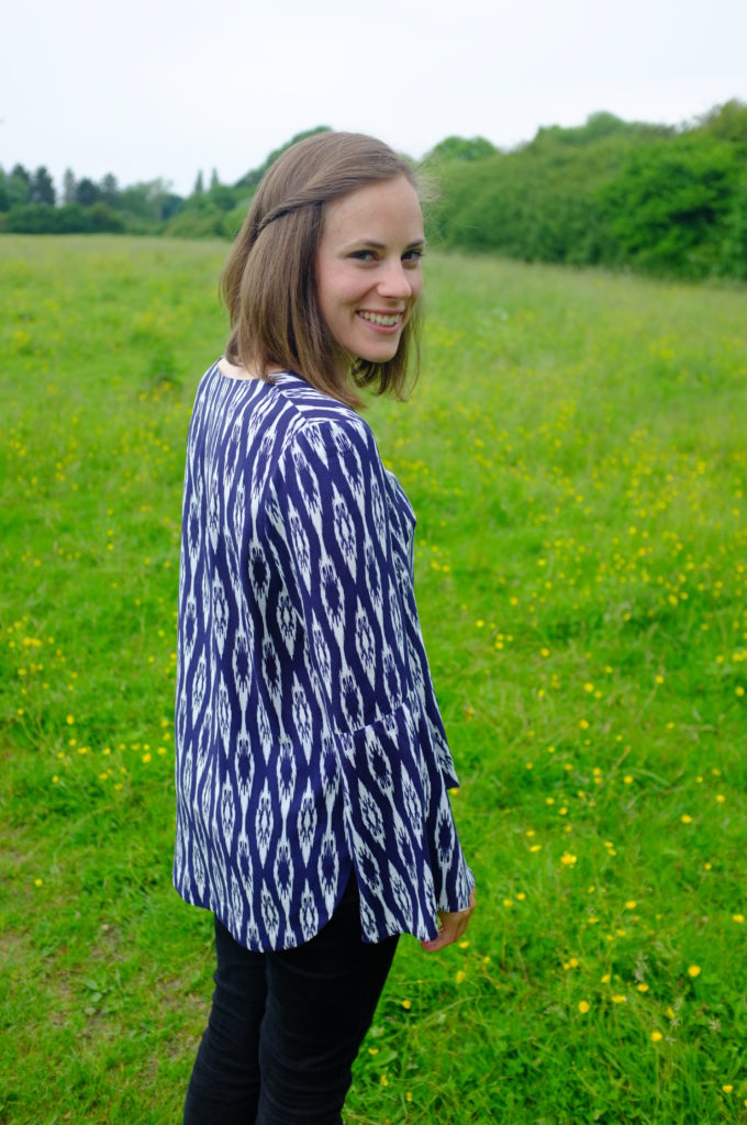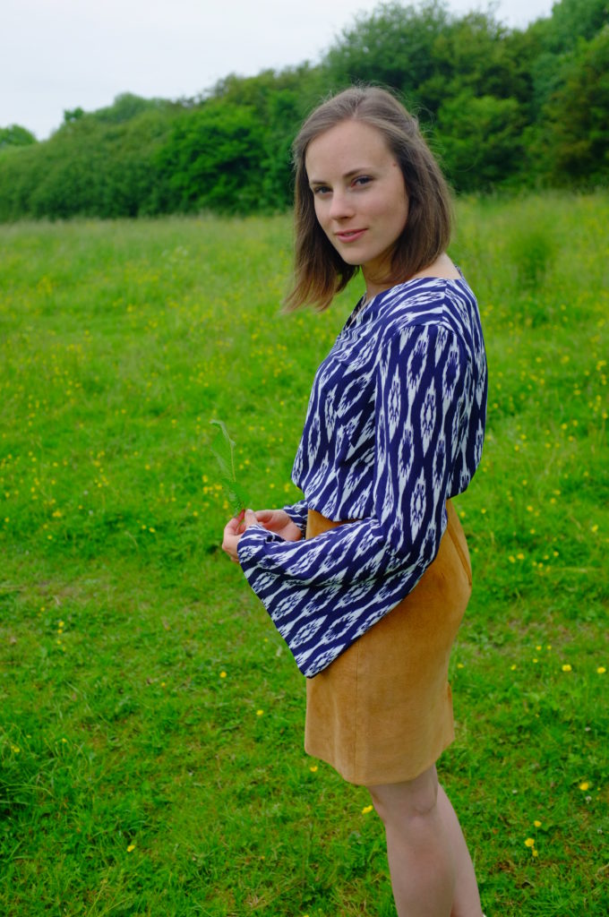 This is definitely a statement blouse, something I didn’t have in my wardrobe before. The sleeves are quite unusual and do sometimes get in the way, but they work well on a night out (I wore this to a hen do) or can be tamed under a cardigan. My favourite feature is the faced hem. Even though the difference between the front and the back is a tad too extreme for my taste (as mentioned, this has been changed in the final patterns), I absolutely love the shape of the hem. Thanks to the sleeves the blouse feels very seventies, which immediately inspired me to pair it with this vintage leather skirt and hippie hair (as hippie as I can go with my hair). We had lot’s of fun shooting this, me running through the Hinksey fields, picking flowers. While we were completely alone for most of the time, suddenly a group of monks hiked past us, who must have thought we were crazy. Oh the joys of taking blog pictures! Having so much fun, we of course ended up with a lot of weird photos of this blouse, which my boyfriend calls the wizard blouse. Enjoy!
